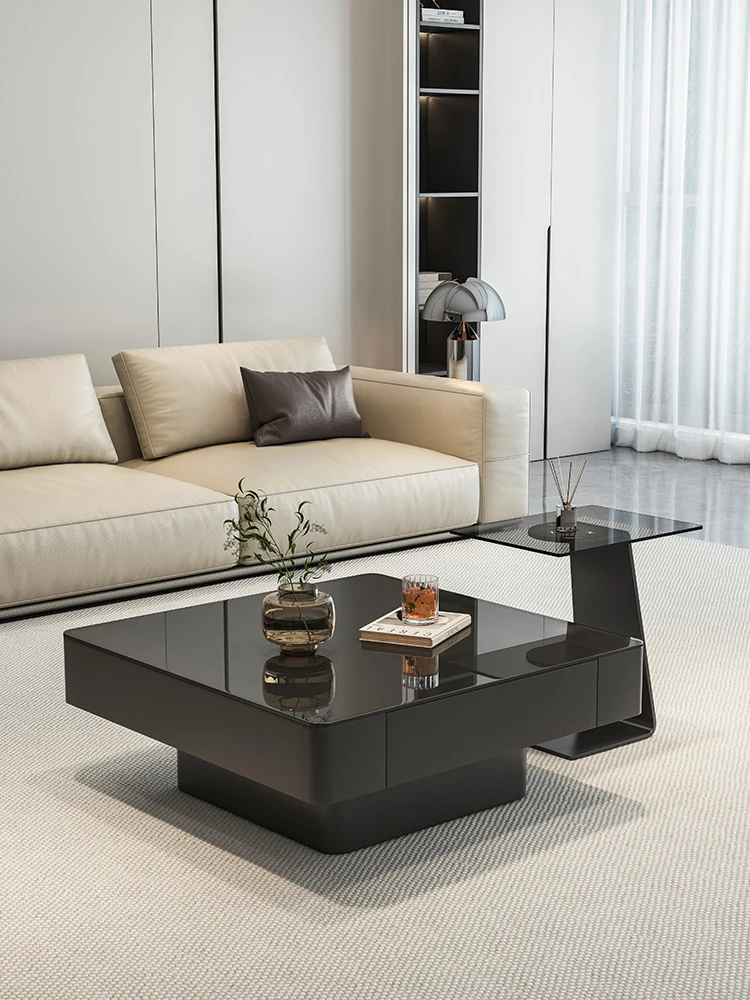 イタリアンスタイルのスクエア岩板ガラスコーヒーテーブル - 小型リビングにぴったりのモダン&ラグジュアリー感あふれるミニマルデザイン、シックなブラック仕上げでおしゃれな空間を演出!