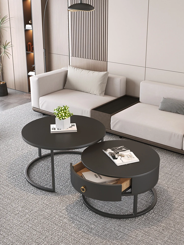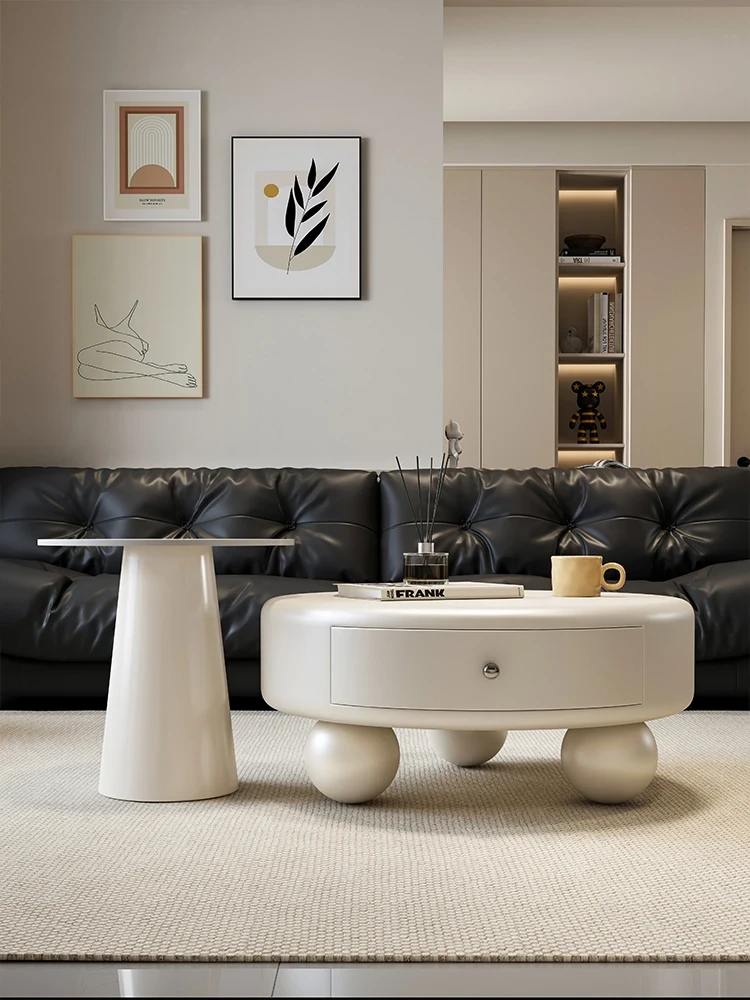 デザイナーの大小の丸型クリーム風クリエイティブコーヒーテーブルセット - 小さなリビングにぴったりの現代的でミニマルな収納機能付き!おしゃれで実用的な空間を演出します。