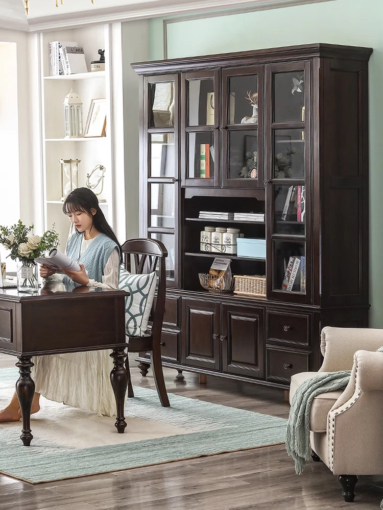 Rustic American Solid Wood Bookcase with Glass Doors – Elegant Vintage European Style Display Shelf for Home Office and Living Room Storage