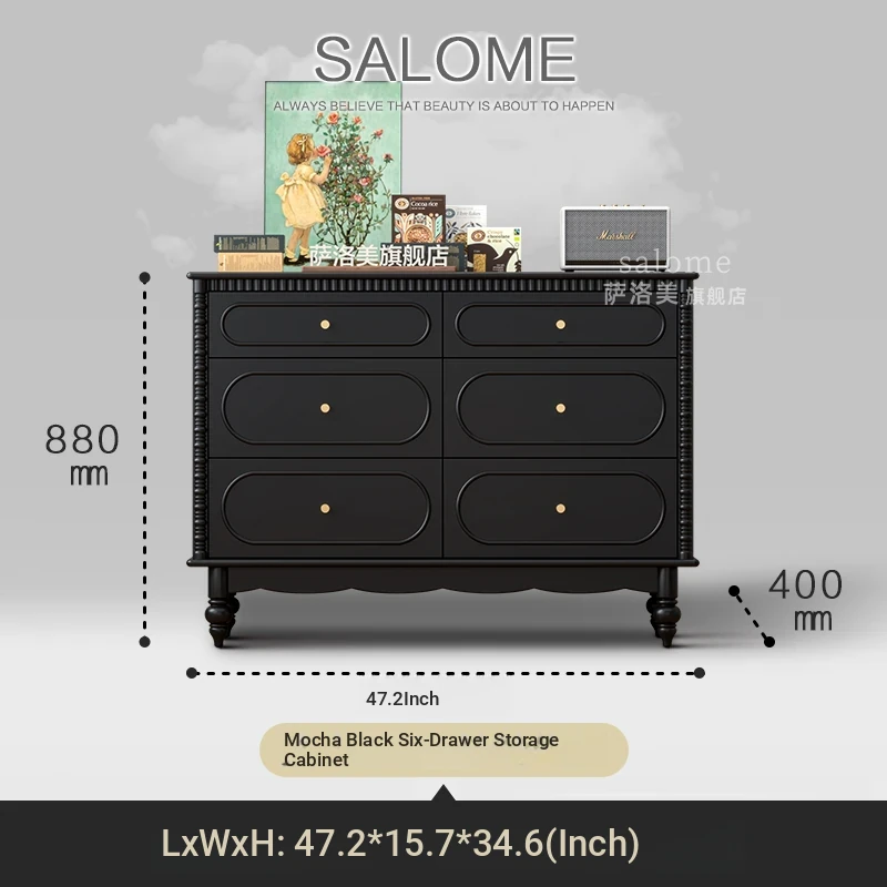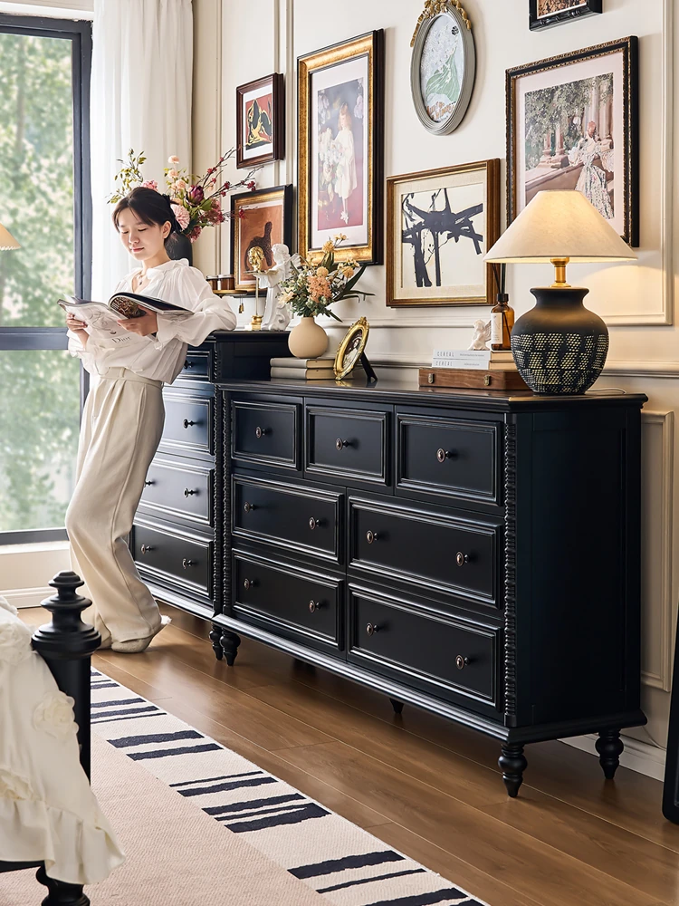 Salome Style Black Solid Wood Nine-Drawer Cabinet - Vintage Luxury Storage Unit for Living Room and Bedroom, Perfect for Wall-Mounted Bed End Organization