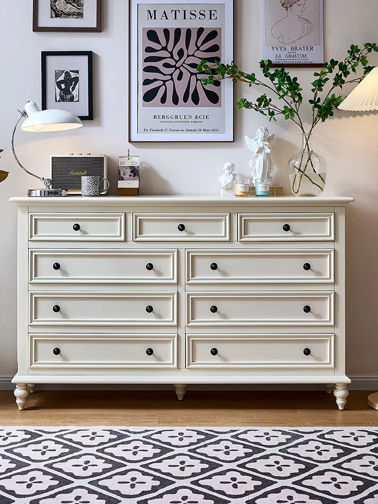 Cream White American Solid Wood Nine-Drawer Storage Cabinet for Small Living Rooms - Wall-Mounted, Ideal for Master Bedrooms and Home Organization
