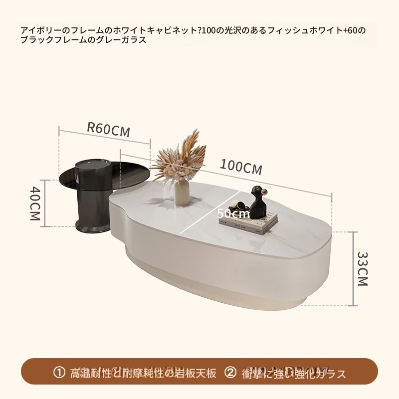 アイボリーフレーム白キャビネット:100ピュアホワイトストーン+60黒フレームグレーガラス
